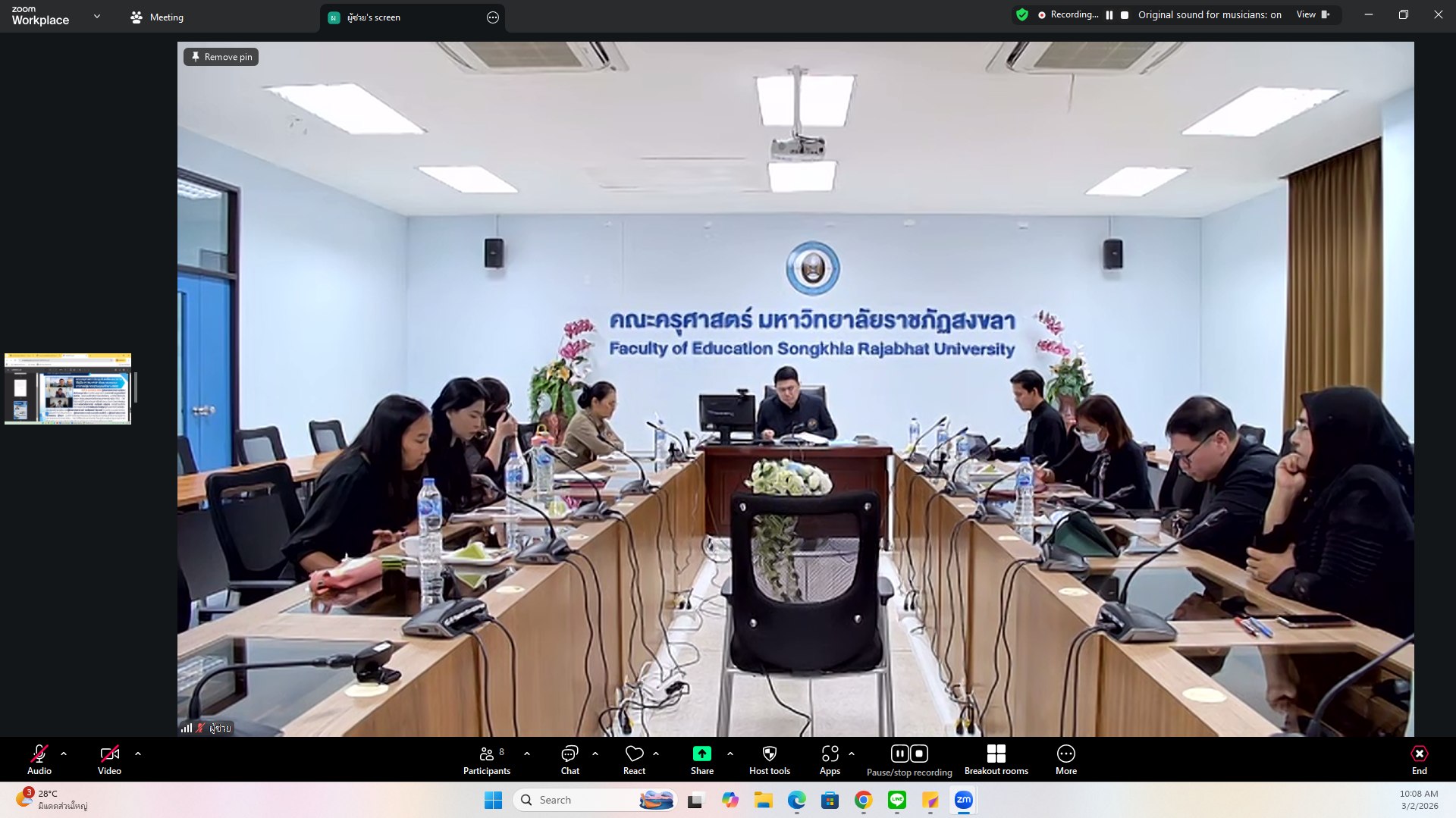 วันที่ 2 มีนาคม 2569 ผู้ช่วยศาสตราจารย์ ดร.โสภณ ชัยวัฒนกุลวานิช คณบดีคณะครุศาสตร์ มหาวิทยาลัยราชภัฏสงขลา เป็นประธานในการประชุมคณะกรรมการประจำคณะครุศาสตร์ ครั้งที่ 1/2569 ณ ห้องประชุมสร้อยระย้า 68-606 คณะครุศาสตร์ และประชุมผ่านระบบออนไลน์ Zoom ในการประชุมครั้งนี้ ผู้ทรงคุณวุฒิ รองคณบดี ตัวแทนประธานหลักสูตร ตัวแทนคณาจารย์ หัวหน้าสำนักงานคณบดี และหัวหน้างาน เข้าร่วมประชุมโดยพร้อมเพรียงกัน เพื่อพิจารณาและติดตามผลการดำเนินงานตามนโยบายของคณะฯ ตลอดจนร่วมกันวางแผนและกำหนดทิศทางการบริหารจัดการในปีงบประมาณ 2569 ให้เป็นไปอย่างมีประสิทธิภาพและสอดคล้องกับยุทธศาสตร์ของมหาวิทยาลัย
